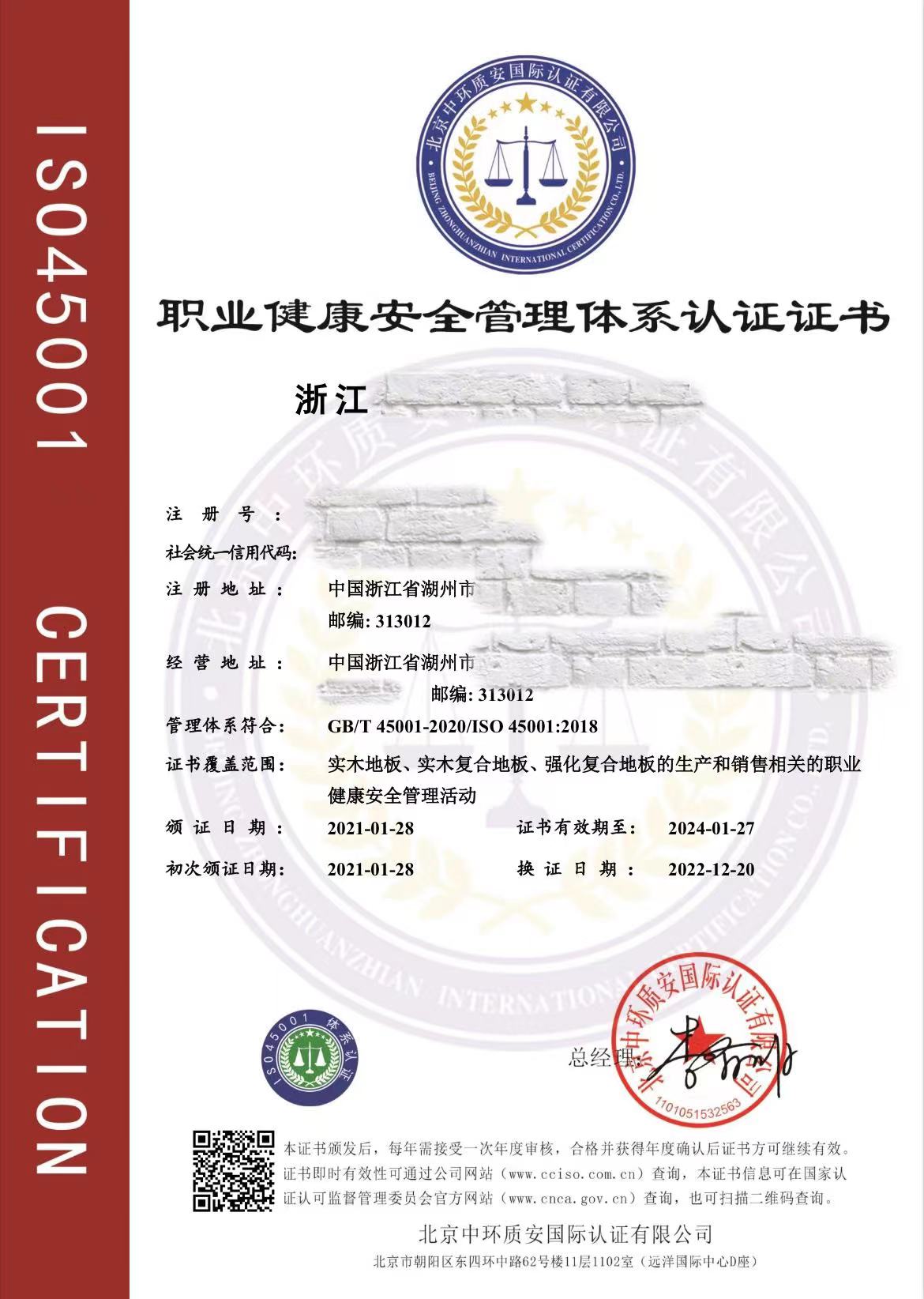 职业健康安全管理体系认证证书