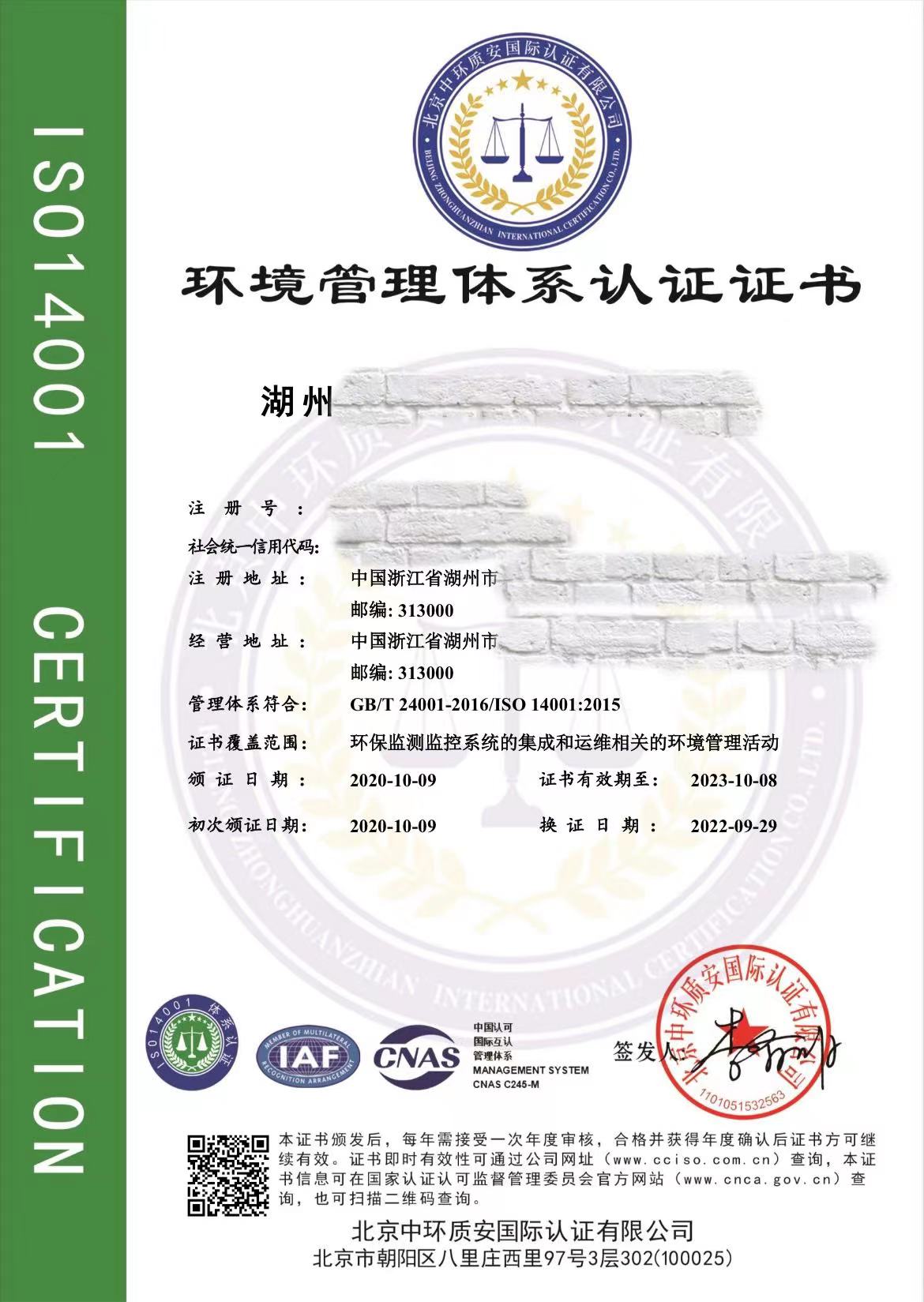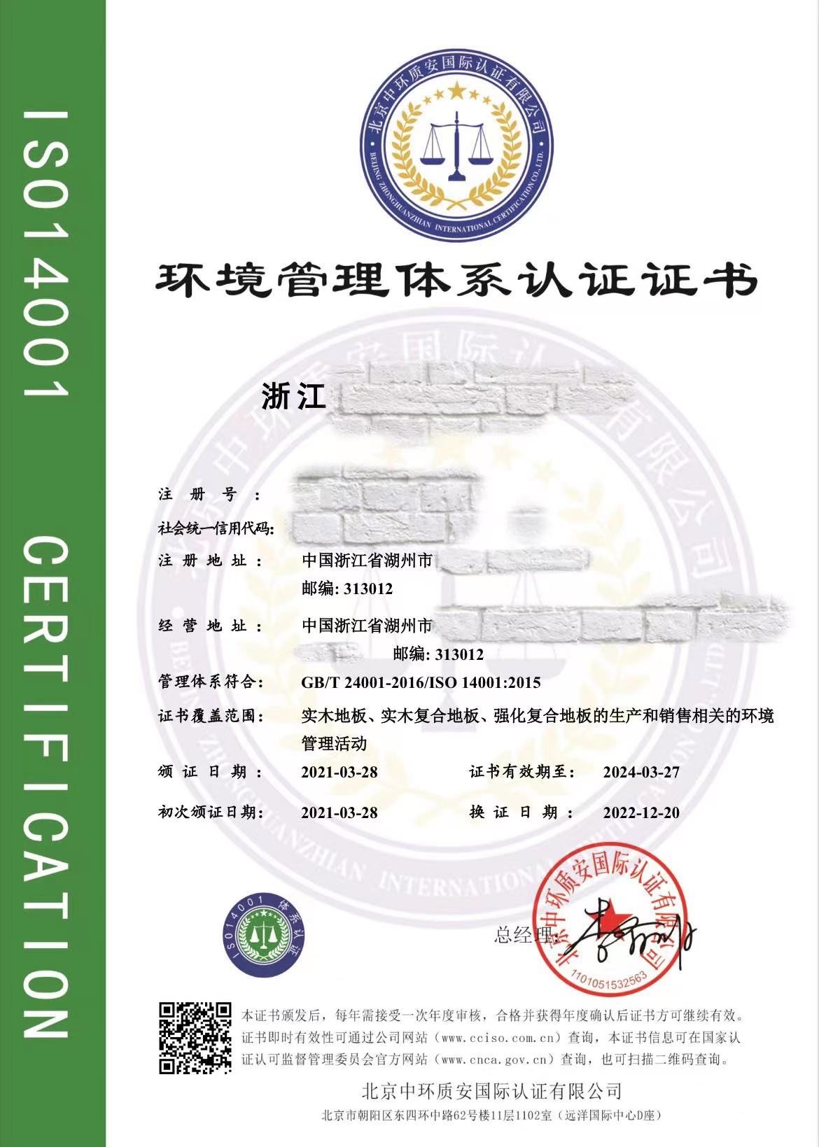 环境管理体系认证证书